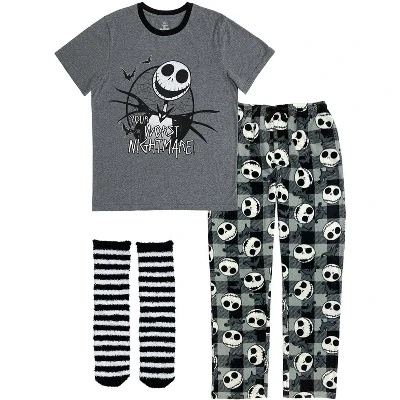 - 3-PIECE PAJAMA SET THAT IS PERFECT FOR THE HOLIDAYS! – There is nothing like putting on a new pair of pajamas and lounging around watching your favorite films or reading your favorite books! This Nightmare Before Christmas Pajama Set makes a delightful gift for you or someone you know this holiday! Material is Top: 60% Cotton/40% Polyester Pants: 100% Polyester Microfleece Socks: 99% Polyester/1% Spandex