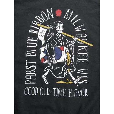 PBR fans are sure to love this men’s black long-sleeve sweatshirt! The Good Old-Time Flavor sweatshirt features a big, colorful graphic that has been professionally printed to ensure long-lasting print quality. The Pabst Blue Ribbon fan apparel is black, with long sleeves for comfort and style in cooler weather. Made of 100% preshrunk cotton jersey, this popular beer brand sweatshirt can be machine washed with like colors, then tumble dried for easy care. The Good Old-Time Flavor graphic sweatshirt is an officially licensed product, and makes a great gift for any PBR fan!