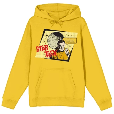Fans of William Shatner’s Captain Kirk will love this men’s yellow graphic hoodie! The Star Trek original series sweatshirt features a big, colorful graphic that has been professionally printed to ensure long-lasting print quality. The Star Trek fan apparel loungewear is bright yellow, and includes an attached hood for style and comfort in cooler weather. The classic Star Trek merchandise is made of 60% cotton and 40% polyester. It can be machine washed in cold water with like colors, then tumble dried for easy care. This Captain Kirk character hooded sweatshirt is an officially licensed product, and makes a perfect gift for a fan of Star Trek.